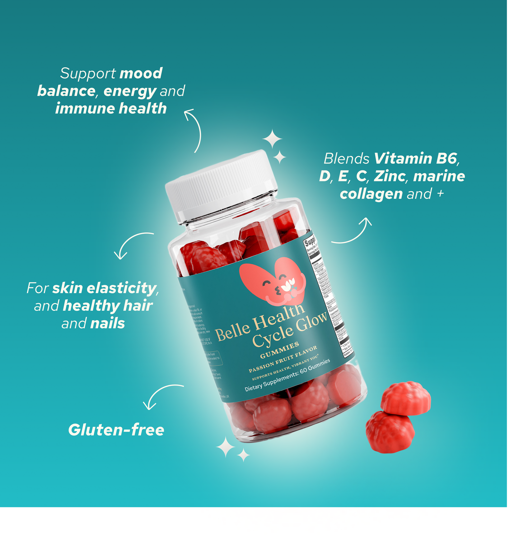 Cycle Glow is a daily gummy supplement designed to support hormonal and mood balance, hair and nails health, and overall well-being throughout your cycle. It’s made with vitamins and minerals that help your body adapt to natural hormonal changes.
